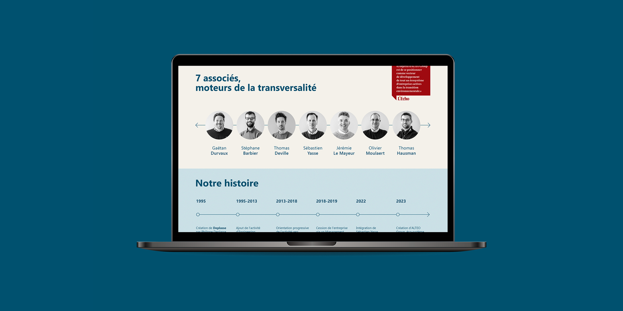 De nos premières réunions a émergé l’image de la Noria, une machine hydraulique inventée originellement par les premières civilisations en Égypte antique et en Mésopotamie, réinventée par des ingénieurs grecs entre le IIIème et le IIème siècle avant Jésus-Christ. Chaque branche de cette machine représente les différentes entités regroupées sous Alteo Group, qui ensemble, peuvent déployer leur force et permettre de développer la transition environnementale. Cette roue ancestrale symbolise le mouvement perpétuel, l’énergie, le dynamisme, la circularité, le travail qui se co-construit en équipe, étape après étape.